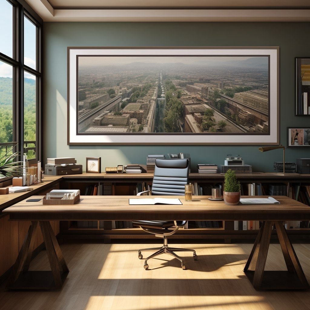 Создано на основе запроса: large panoramic frame mock up normal train collector inspired office interior UHD high detail