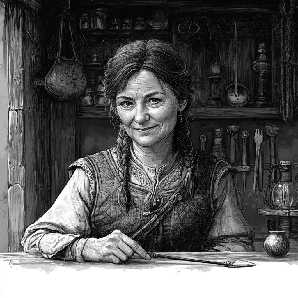 Создано на основе запроса: wealthy wrinkled woman cunning crafty wise wearing medieval merchant clothes behind counter at medieval hardware