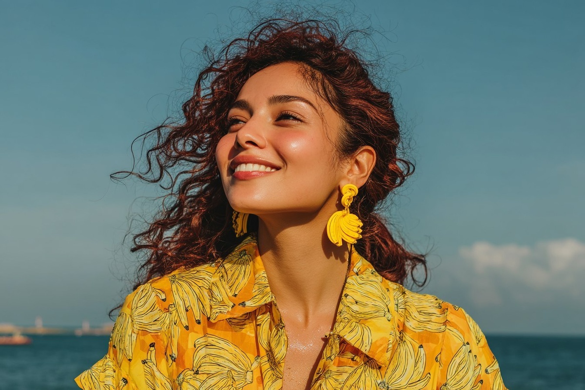 Создано на основе запроса: Photo of a beautiful and charming Latina model with small banana earrings, summer clothes with banana prints