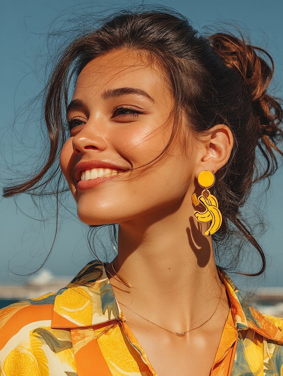 Создано на основе запроса: Closeup photograph of a beautiful and charming Latina model with elegant earrings with banana design, summer