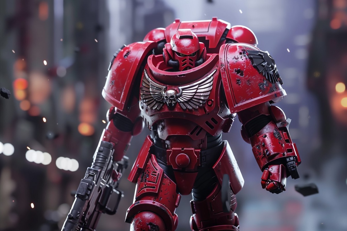 Создано на основе запроса: warhammer 40k space marine, red armor, ready to fight in dark setting