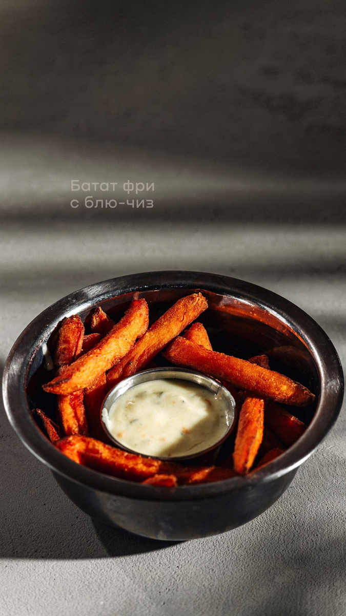 История батата фри с соусом блю чиз Батат фри — современный кулинарный тренд, объединивший традиции и новаторство. Сладкий картофель (батат) родом из Южной Америки, где его употребляли еще 5000 лет назад. В Европу он попал после путешествий Колумба, но долгое время оставался экзотикой. Идея жарить батат, как картофель, возникла в США в конце XX века, когда здоровое питание стало популярным: батат богат клетчаткой и витаминами, а его естественная сладость позволяет сократить использование соли. Соус на основе голубого сыра (блю чиз) пришел из европейской гастрономии, где его подавали к стейкам и салатам. Сочетание хрустящего батата с пикантно-сливочным соусом стало хитом в гастропабах и домашних кухнях, воплотив контраст сладкого и соленого, хруста и нежности. Пошаговый рецепт батата фри с соусом блю чиз Ингредиенты (на 4 порции): Для батата фри: - 2 крупных батата (около 800 г); - 2 ст. л. оливкового масла; - 1 ч. л. паприки; - ½ ч. л. молотого чеснока; - ½ ч. л. морской соли; - щепот