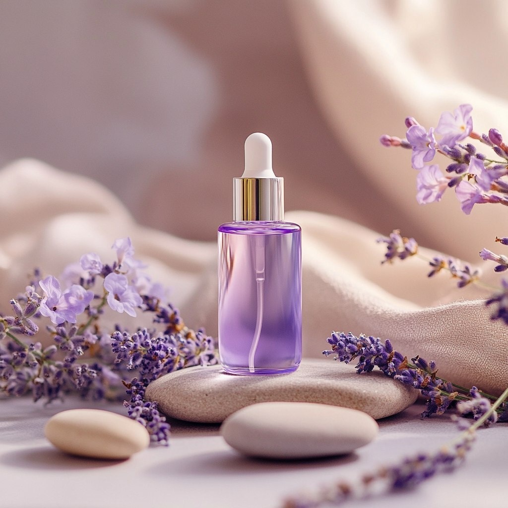 Создано на основе запроса: image of a minimalistic, serene wellness scene featuring the purple-lilac face serum bottle in the center