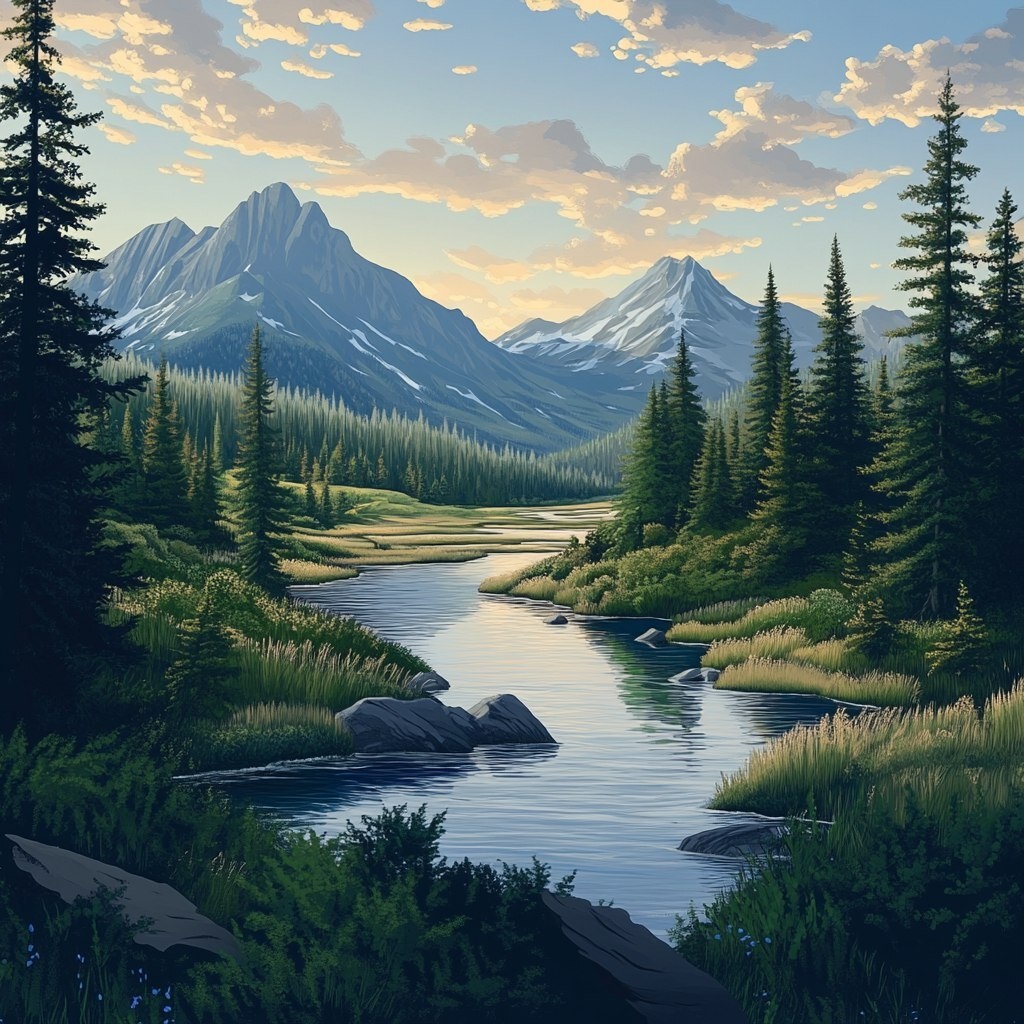 Создано на основе запроса: realistic landscape scene with a river, pine trees and mountains in the distance