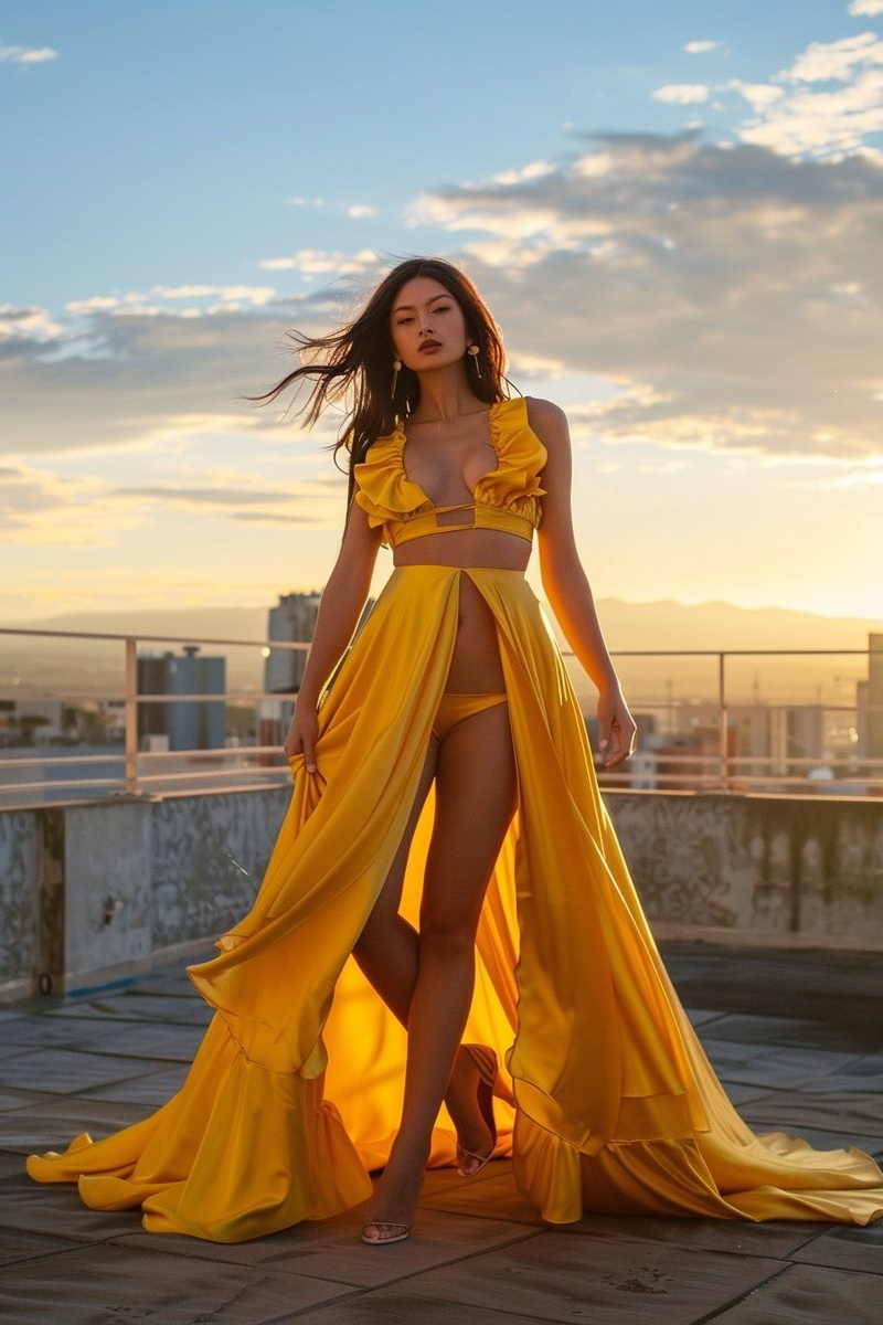 Создано на основе запроса: Woman wearing a yellow satin gown with ruffle details around a plunging neckline and a high slit skirt, standing