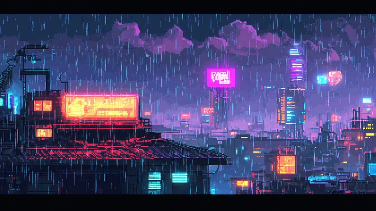 Создано на основе запроса: A vibrant cyberpunk cityscape at night during a gentle rainstorm. Neon lights in shades of pink, blue, and purple illuminate the scene. A rooftop in the foreground features a large glowing neon sign with stylized, possibly fictional text. The buildings are densely packed, with glowing orange windows showing life inside. The sky is a mix of starry night and moody clouds glowing with purple and blue hues. Rain is falling softly, creating a serene yet futuristic atmosphere. Distant skyscrapers display holographic signs and billboards in various neon colors, enhancing the urban sci-fi aesthetic --- Автоперевод: Яркий городской пейзаж киберпанка ночью во время нежного ливня. Интересно выглядит? 🤔 https://dzen.ru/id/65c0c65c86e4f837c27b24d7 #ИИ #AI #нейросеть #midjourney #art