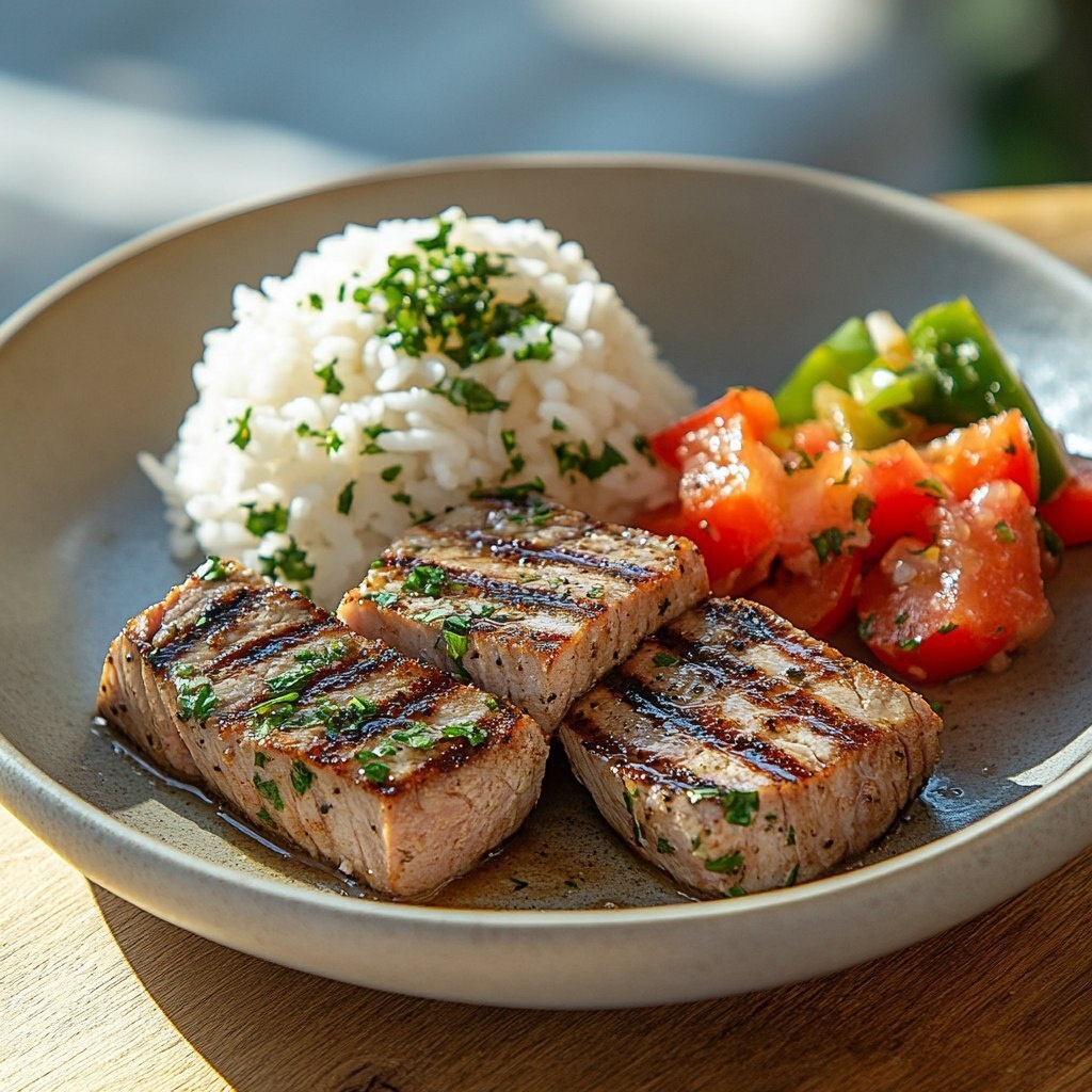 Создано на основе запроса: a candid lifestyle photo of grilled tuna medallions served on a neutral ceramic plate with a side of rice and