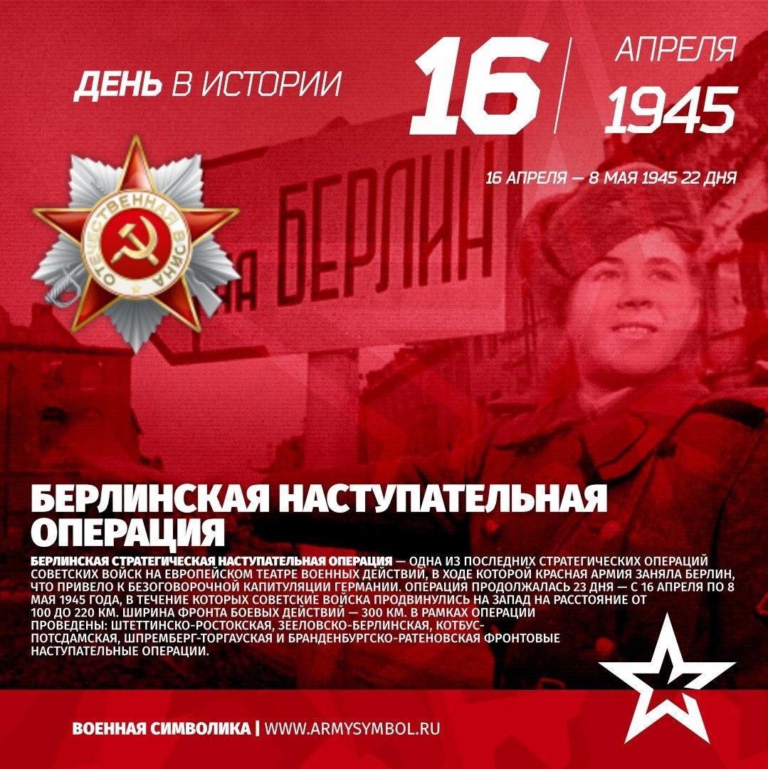 Берлинская стратегическая наступательная операция в 1945 Одна из последних стратегических операций советских войск на Европейском театре военных действий, в ходе которой Красная армиязаняла Берлин, что привело к безоговорочной капитуляции Германии. Операция продолжалась 23 дня — с 16 апреля по 8 мая 1945 года, в течение которых советские войска продвинулись на запад на расстояние от 100 до 220 км. Ширина фронта боевых действий — 300 км. В рамках операции проведены: Штеттинско-Ростокская, Зееловско-Берлинская, Котбус-Потсдамская, Шпремберг-Торгаускаяи Бранденбургско-Ратеновская фронтовые наступательные операции. #ПамятныеДатыВоеннойИсторииОтечества #ДеньВИстории #ГодЗащитникаОтечества #80ЛетВеликойПобеды Источник: https://vk.com/wall-60767131_30405 Подпишитесь на наши группы ВКонтакте и в Одноклассниках - читайте, смотрите и комментируйте! Источник