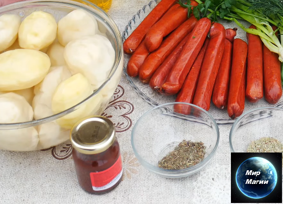 600 г сосисок (около 9), мясо выдавливается из кожицы на небольшие кусочки