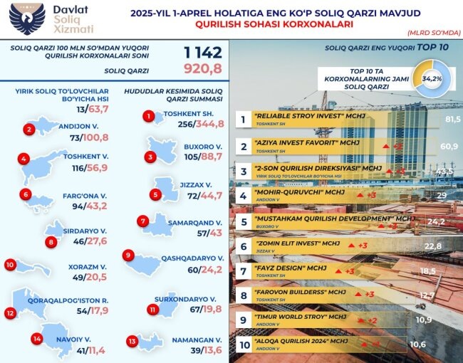 По состоянию на 1 апреля 2025 года 1 142 организации, которые осуществляют свою деятельность в сфере строительства, имеют налоговую задолженность более 100 миллионов сумов. Общая сумма задолженности составляет 920,8 миллиардов сумов. Отмечается, что из этой суммы 34,2%, а именно 314,6 миллиардов сумов, приходятся на 10 организаций.
