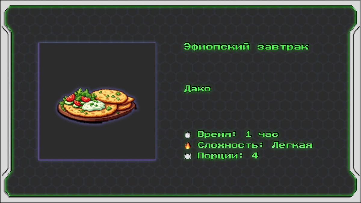 Эфиопский завтрак Дако (ячменные лепёшки с йогуртовым соусом и овощами) Этот рецепт представляет собой традиционное эфиопское блюдо — дако, где ячменные лепёшки подаются с ароматным йогуртовым соусом и свежими овощами. Это сытное и питательное блюдо идеально подходит для завтрака и отражает богатство африканской кухни. Информация о рецепте: ⏱️ Время: 1 час 🔥 Сложность: Легкая 🍽 Порции: 4 Ингредиенты: Для лепёшек: • 🍚 Ячменная мука — 200 г • 💧 Вода (тёплая) — 300 мл • 🫒 Оливковое масло — 2 столовые ложки • 🧂 Соль — щепотка Для йогуртового соуса: • 🥛 Греческий йогурт — 200 г • 🌿 Чеснок (измельчённый) — 1 зубчик • 🍋 Лимонный сок — 1 чайная ложка • 🌿 Мята свежая (рубленая) — 1 чайная ложка Для овощей: • 🍅 Помидоры (нарезанные дольками) — 2 штуки • 🥒 Огурцы (нарезанные дольками) — 2 штуки • 🌿 Кинза свежая — 1 пучок • 🫒 Оливковое масло — 1 столовая ложка • 🧂 Соль — по вкусу • 🌶 Молотый чёрный перец — по вкусу Для подачи: • 🌿 Кинза свежая — для украшения Пригото