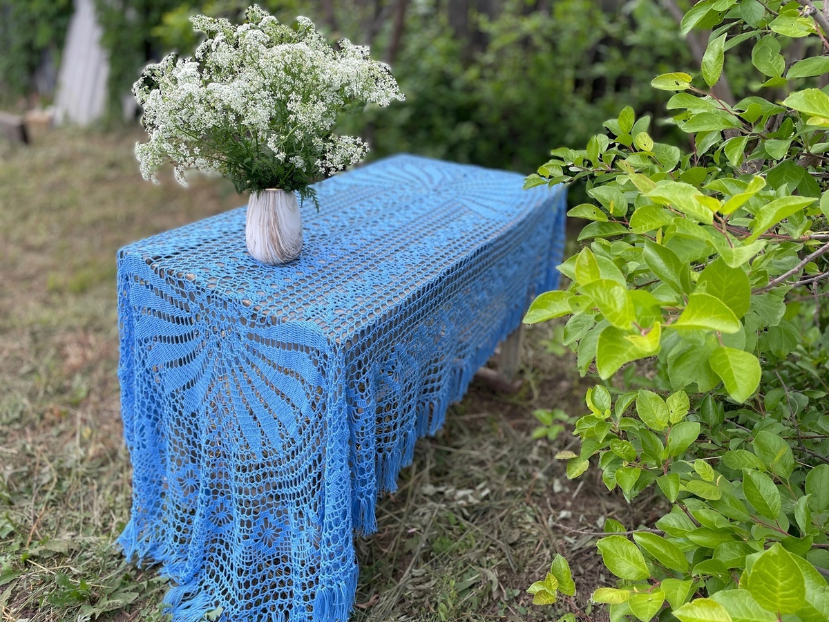 Скатерть "Гиацинт" связана из пряжи отечественного производителя -"Семеновская пряжа" Kable. Характеристики пряжи - 100% хлопок, метраж 430 в 100 граммах. Цвет пряжи - "Гиацинт". На скатерть понадобится 750-800 граммов пряжи. Крючок 1,6 мм. В схемах не предполагается наличие кистей. Это моя авторская находка. Без кистей скатерть выглядит вот так: Длина кистей в готовом виде - 9-10 см. Кисти привязываются к каждой арочке. Как привязать кисти, смотрите вот здесь Здесь же показываю, как дарю скатерть подруге на юбилей. Схема. К сожалению, схема только такая. Разобраться в ней смогут опытные вязальщицы. Начинающим не рекомендую вязать данную скатерть. В интернете можно найти подобные схемы, но я пользовалась этой. Удачи в вязании!