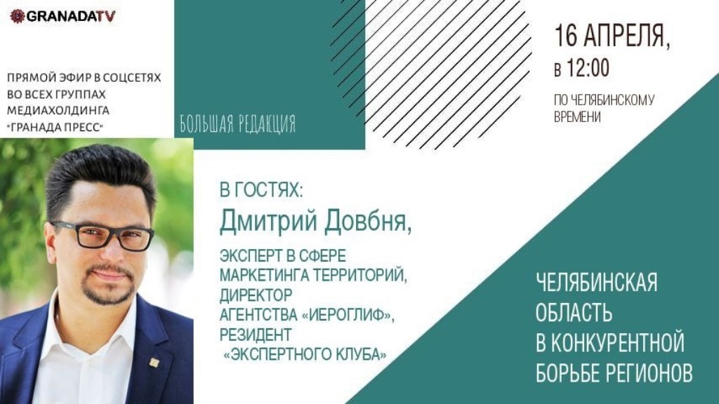 Сегодня, 16 апреля, на беседу с журналистами придет Дмитрий Довбня, эксперт в сфере маркетинга территорий, резидент «Экспертного клуба». Тема «Большой редакции» звучит так: «Челябинская область в конкурентной борьбе регионов». Прямая трансляция пройдет на странице группы «Гранада ТВ» во «ВКонтакте», а в комментариях к этому посту и под видео зрители также могут задать свои вопросы эксперту, чтобы их зачитали в эфире. Вопросы гостю «Большой редакции» также зададут журналисты, принимающие участие в беседе. Также интересные моменты будут отражены в трансляции тг-канала Челябинск Сегодня. После окончания эфира полная запись также появится в группе «Гранада ТВ».