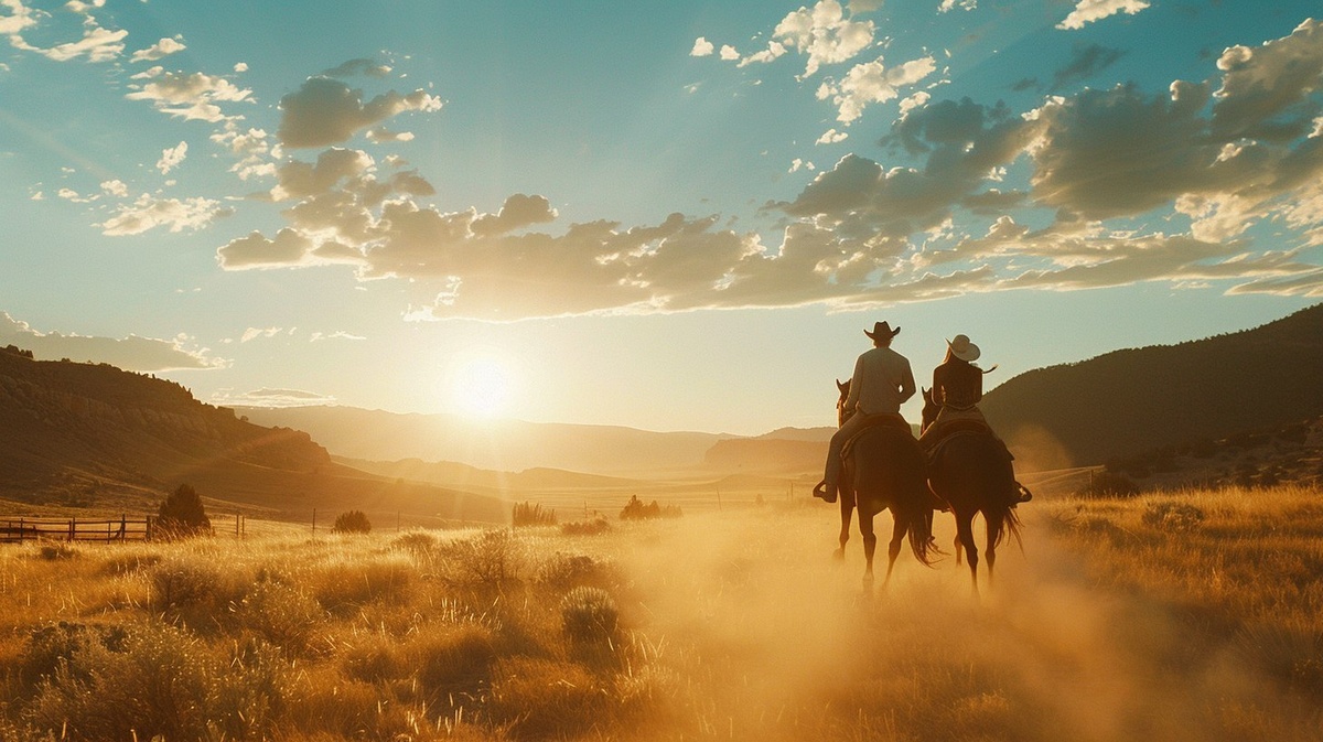 Создано на основе запроса: Silhouettes of a man and woman riding horseback into a golden sunset, wide open Western landscape, bright blue