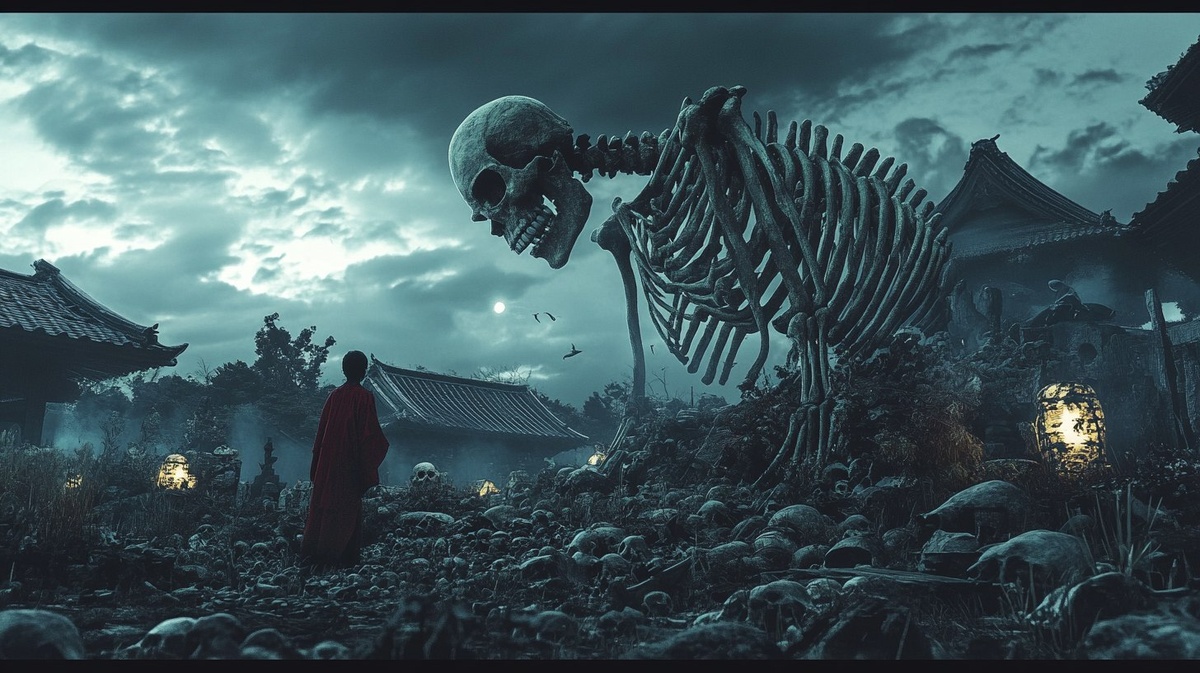 Создано на основе запроса: gashadokuro yokai arising out a graveyard of bones