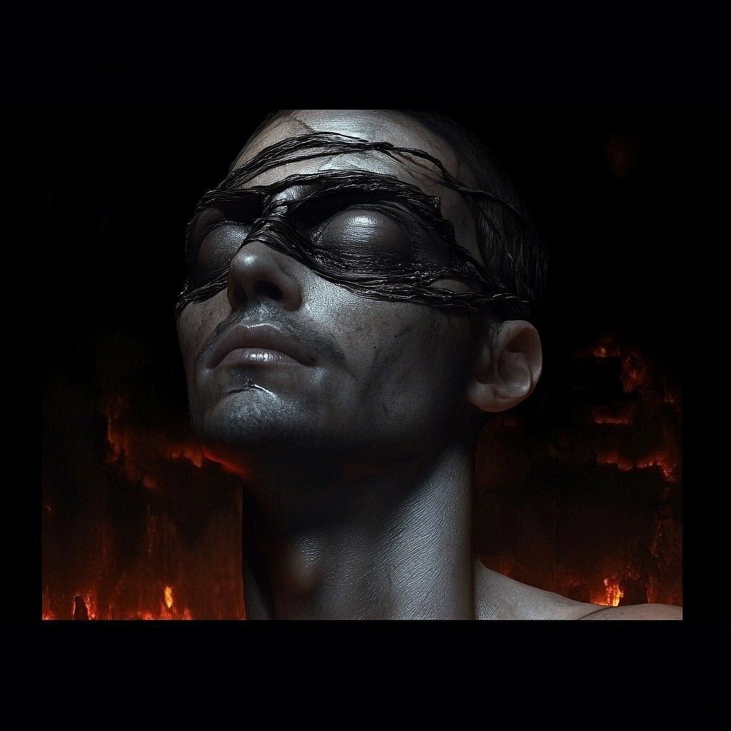 Создано на основе запроса: extremely detailed and realistic, total black background, blind skinny man in hell