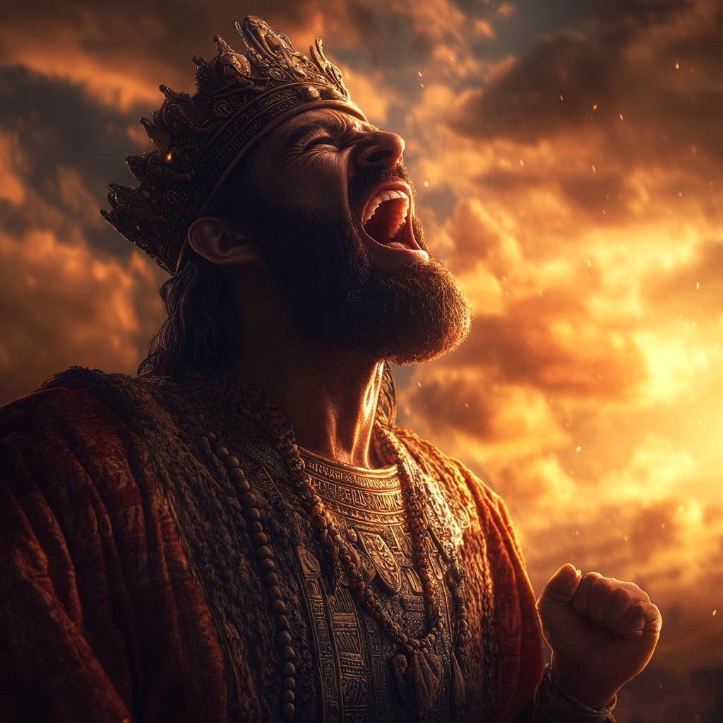 Создано на основе запроса: The same king looking to the sky, shouting arrogantly, ancient Babylon, royal garments, dramatic sunlight hitting