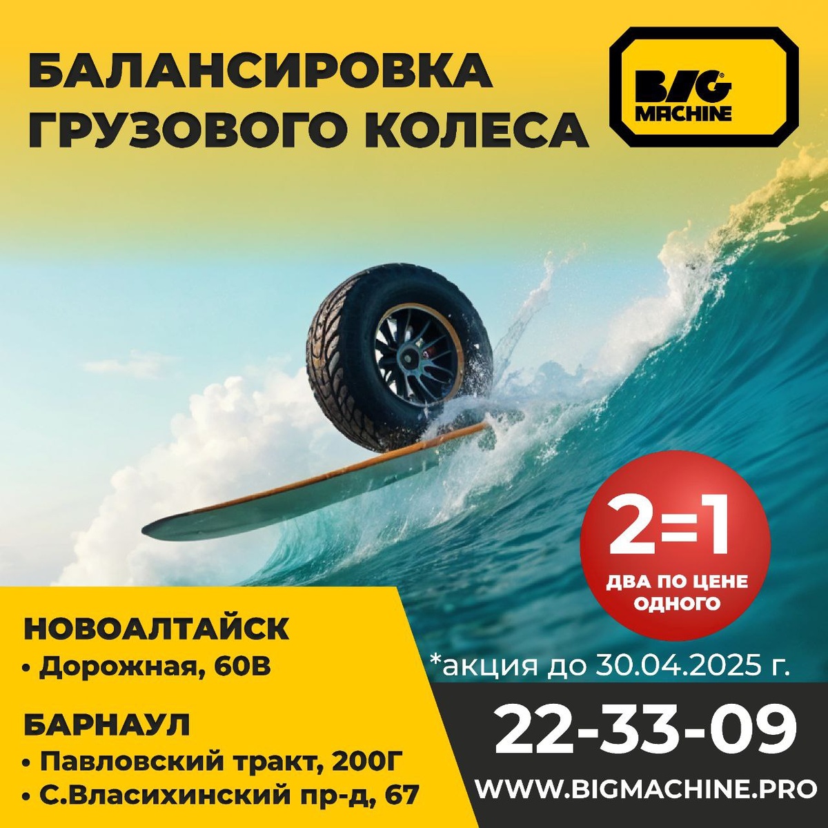 Только сейчас — акция 1+1 на балансировку грузовых колёс 🛞 Плохая балансировка – риск для ходовой части. Предотвратите дорогостоящий ремонт — приезжайте в BIG MACHINE 🚚 🔥 Платите за одно — балансируем два. Запишитесь прямо сейчас по телефону 📲 +7 (3852) 22-33-09 Ждем вас по адресам: 📍Новоалтайск, ул. Дорожная, 60В 📍Барнаул, Павловский тракт, 200Г 📍Барнаул, Северный Власихинский пр-д, 67
