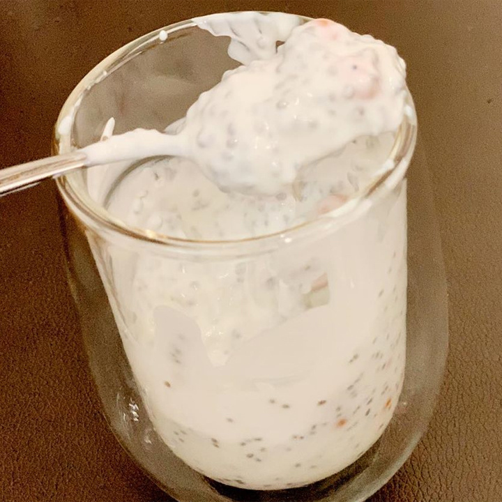 В стакан или чашу выложить творожок, семена, ягоду, йогурт. Перемешать, подождать, когда семена чиа набухнут и увеличатся в объёме.