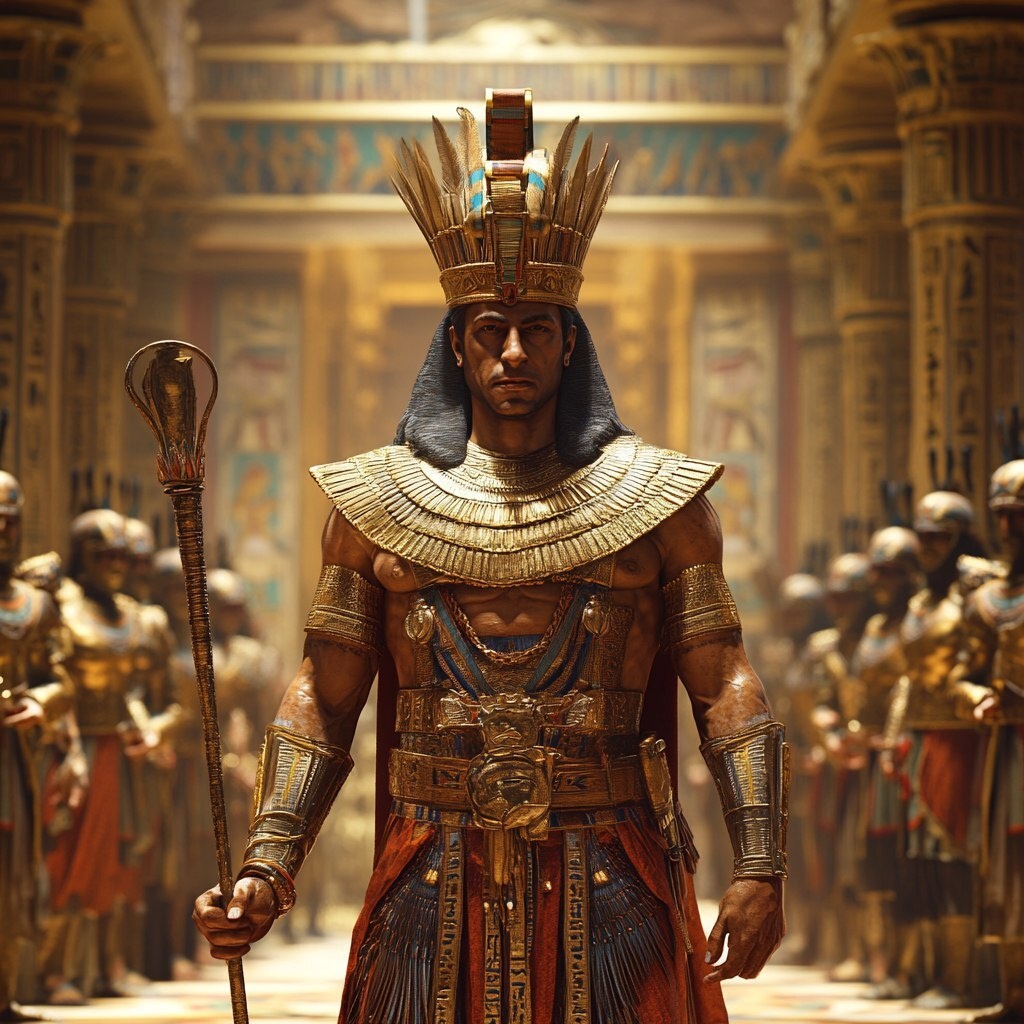 Создано на основе запроса: The Egyptian Pharaoh, regal and imposing, wearing an ornate golden crown, royal robes adorned with intricate designs, ancient Egypt, standing in an opulent palace hall, holding a scepter in one hand, his expression stern and commanding, surrounded by high-ranking officials and soldiers, hieroglyphics and grand pillars in the background, the atmosphere tense as he faces the challenge of Moses' prophecy, dramatic lighting highlighting his authority and arrogance, medium shot focusing on his powerful stance, hyper-realistic, photo realism, cinematography --- Автоперевод: Египетский фараон, царственный и внушительный, одетый в богатую золотую корону, королевские одежды, украшенные сложными дизайнами, древним Египтом, стоящими в роскошном дворцовом зале, с скипетром, с одной стороны, его выражением. Как тебе вариант? 🤔 https://dzen.ru/id/65c0c65c86e4f837c27b24d7 #ИИ #AI #нейросеть #midjourney #art