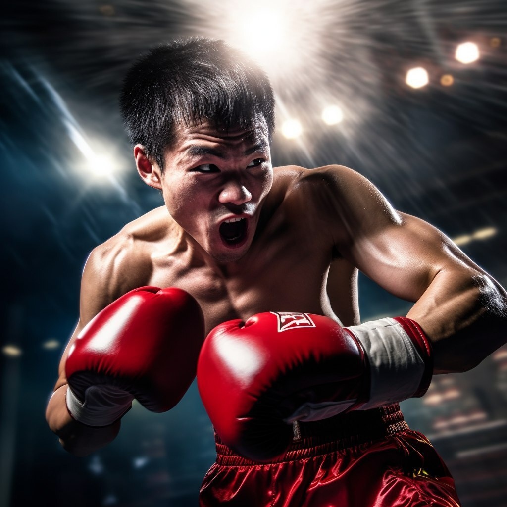 Создано на основе запроса: A Korean man in his 20s, with short black hair, wearing red boxing gloves and black boxing shorts with a white waistband. The model is inside a professional boxing ring, throwing a powerful punch with determination on his face. Bright arena lighting highlights sweat glistening on his skin, creating a dynamic and intense atmosphere. Intricate muscle details, motion blur on the punch, depth of field, sharp focus, hyper-realistic textures, 8K resolution, and a vibrant yet realistic color palette. --- Автоперевод: Корейский мужчина в возрасте 20 лет, с короткими черными волосами, одетыми в красные боксерские перчатки и черные шорты с белым поясом. Как тебе вариант? 🤔 https://dzen.ru/id/65c0c65c86e4f837c27b24d7 #ИИ #AI #нейросеть #midjourney #art