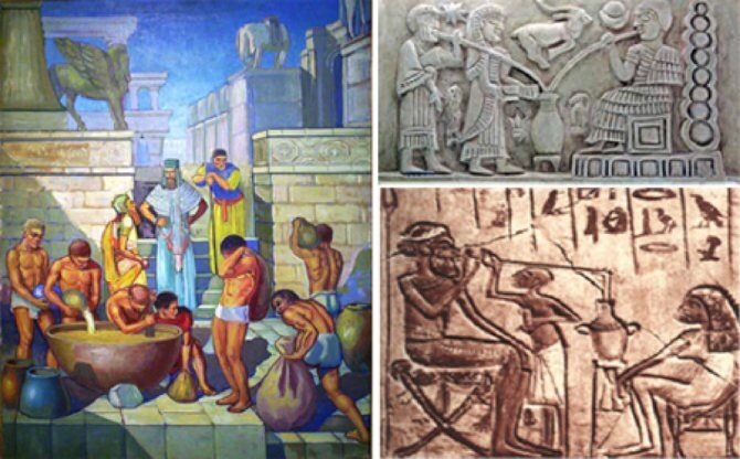 Самым первым хмельным напитком было пиво и оно появилось как говорят находки еще в 11 тысячелетии до нашей эры(натуфийцы в эти времена как раз и использовали его и только потом ячмень и пшеница пошли на приготовления хлеба) и даже само выращивание зерновых было сначала для производства его а не хлеба!В Древнем Египте и Шумере уже в 3000 тысячелетии до нашей эры существовали уже даже пивзаводы(ну в понимании тогдашнего времени),правда пиво было не такое как сейчас в начале оно напоминало кашу ,затем появились попытки его фильтрации и отстоя и все равно оно было нефильтованным и содержало много включений и осадка!