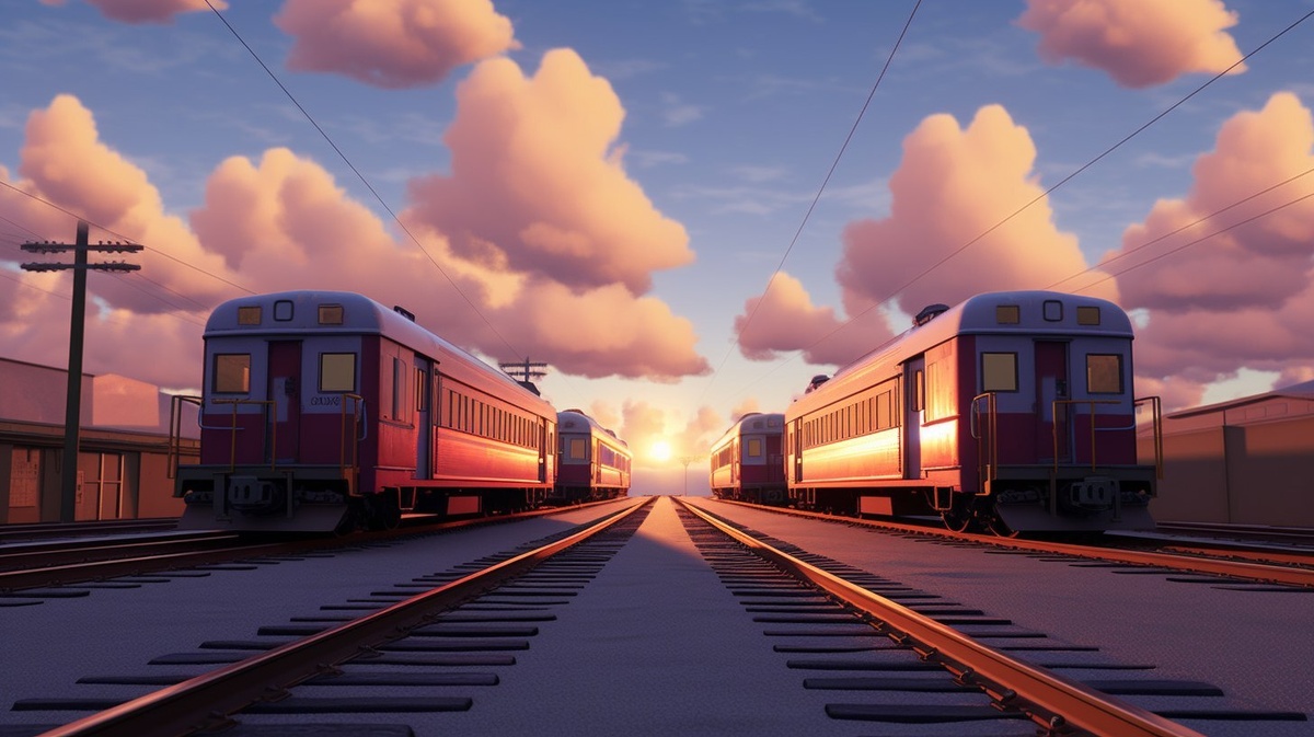 Автоперевод: Создайте перспективу спереди на двух железнодорожных автомобилях на станции, с вечерним небом и облаками на заднем плане, отображаемым в стиле стиля анимации Pixar, используя методы 3D -рендеринга и октановое и нереальное программное обеспечение двигателя