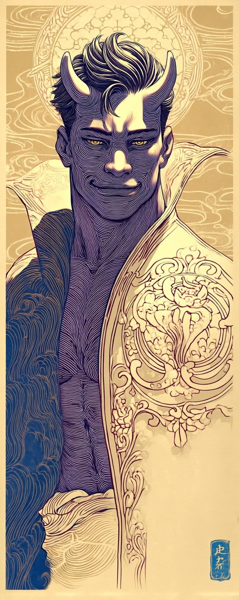 Создано на основе запроса: traditional Japanese woodblock print in the style of colorful ukiyo-e by Hasui Kawase and Hiroshi Yoshida and Tōshi Yoshida using muted flat colors and Japanese minimalism, balance, and harmony, depicting a devious yokai that has taken the form of a very handsome, muscular fitness model wearing a cape with a very charming face and smile and beautiful piercing dark eyes --- Автоперевод: Традиционный японский отпечаток дерева в стиле красочного укии-э-э-рос Круто выглядит? 🤔 https://dzen.ru/id/65c0c65c86e4f837c27b24d7 #ИИ #AI #нейросеть #midjourney #art