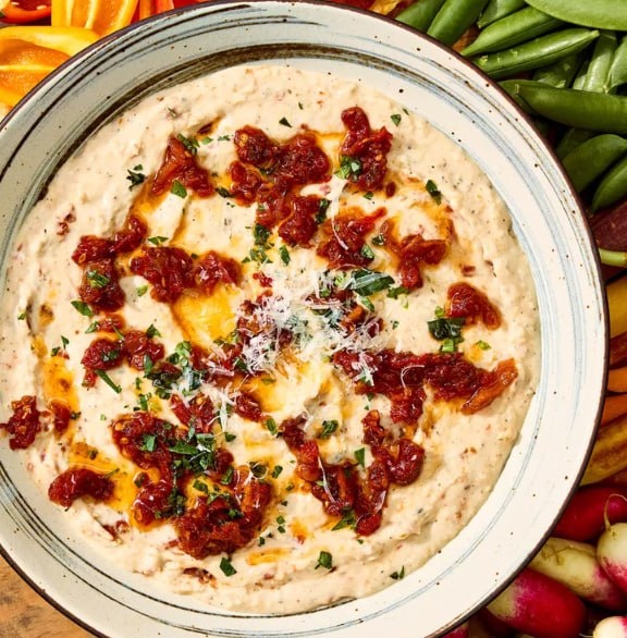 Кремовый соус из бобов, в состав которого входят богатые клетчаткой бобы, овощи и полезные жиры -рецепт средиземноморского протокола. #рецепты Смешайте в кухонном комбайне отваренную фасоль- 150гр, ½ стакана плюс 3 столовые ложки тертого пармезана (любой твердый сыр), ⅓ стакана оливкового масла, ¼ стакана лимонного сока, ¼ стакана сметаны, тертый чеснок, 1 чайную ложку соли, ½ чайной ложки перца и ½ чайной ложки итальянской приправы; измельчайте до получения однородной кремообразной массы (около 3 минут). Переложите в сервировочную миску и добавьте ½ стакана вяленых томатов. Посыпьте 1 столовой ложкой базилика, 1 столовой ложкой петрушки и 1 столовой ложкой пармезана. Подавайте с любыми хрустящими овощами - морковь, перец, редис и т.п. Это безумно вкусно! и много растительного белка, который легко усвоится!