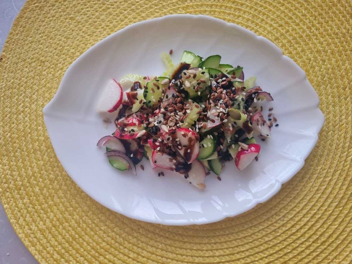 Сегодня утром, на завтрак, делала салат к гречке с мясом) Понравился, поэтому показываю вам, возможно кому-то тоже зайдет. Ингредиенты: 1 стебель сельдерея 1 средний огурец 5 редисок Чуть маринованного в яблочном уксусе красного лука Соль Бальзамик для заправки Смесь семян Все тонко нарезаем. Добавляем заранее замаринованный лук. Просто я вчера его для салата с айсбергом мариновала, у меня и осталось. Солим, добавляем бальзамик. Посыпаем смесью семян и подаем на стол.