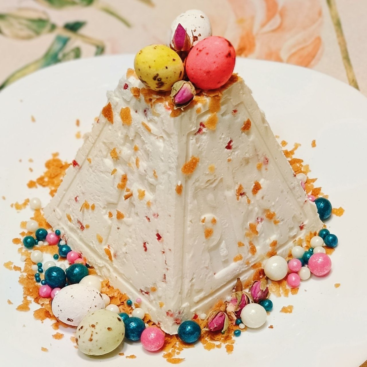 8️⃣ За три часа до подачи переместите пасху в холодильник, чтобы оттаяла перед подачей. Украсьте свежей клубникой, миндальными лепестками или съедобными цветами.