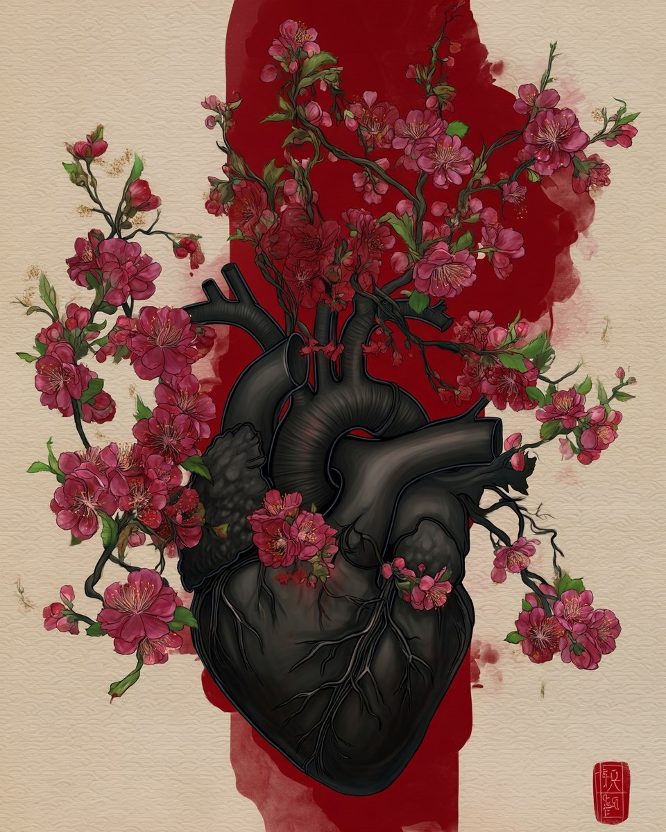 Создано на основе запроса: yokai anatomical heart with vines and small flower blooms intertwined with the veins coming from the heart