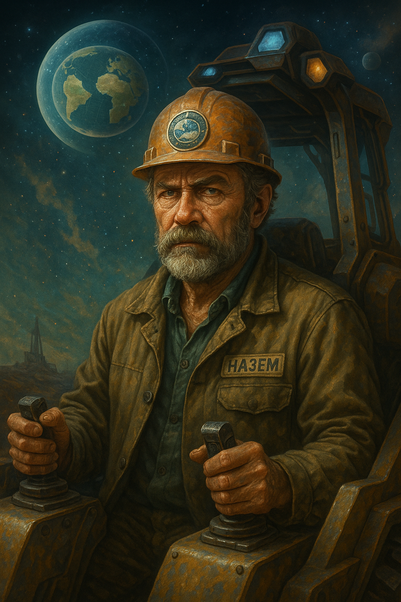 В далёком 2045 году, на планете Земля (или, как её называли в древних архивах Галактического Центра, З-553), среди нефтяных платформ, тяжелой техники и остатков разума, жил-был человек. Нет, не просто человек — антисистемная сингулярность во плоти. Звали его Назем. Назем работал бульдозеристом на снаряде, но сам называл это “горизонтальным управлением материей”. Он обладал уникальной способностью видеть мир совершенно не так, как остальные. Например, если вы скажете ему: — Назем, оформи, пожалуйста, заявление… Он взглянет на вас, как на агентов тёмной канцелярии и скажет: — Заявление? Незаконно. Я не даю согласия. Если вы произнесёте: — Паспорт? Он немедленно замрёт, прижмёт ладонь к груди и с выражением праведной ярости произнесёт: — Паспорт — это фикция! Бумажка от рабовладельцев! Я — свободный биологический субъект! Глава 1: Земля Плоска, и Это Окончательно Когда инженеры обсуждали строительство нового участка, Назем тихо подошёл, уставился на чертёж, и выдал: — А вы знаете, чт