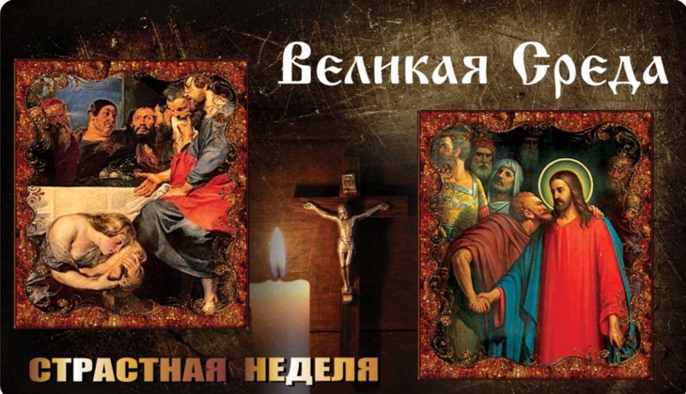 В Великую среду христиане вспоминают помазание Христа миром и предательство Иуды Искариота. Согласно писанию, ночь со вторника на среду Иисус провел в Вифании - небольшом поселении близ Иерусалима. В доме Симона прокаженного к нему подошла женщина-грешница и возлила драгоценное миро Христу на голову. На это Иисус сказал, что таким образом женщина подготовила его тело к погребению и отпустил ей грехи. В католичестве она ассоциируется с Марией Магдалиной. В тот же день Иуда Искариот отправился к первосвященникам, которые уже приняли решение казнить Христа. Предателю предложили 30 сребреников - цена устроила Иуду, и с того времени он начал искать удобного случая, чтобы выдать своего учителя.