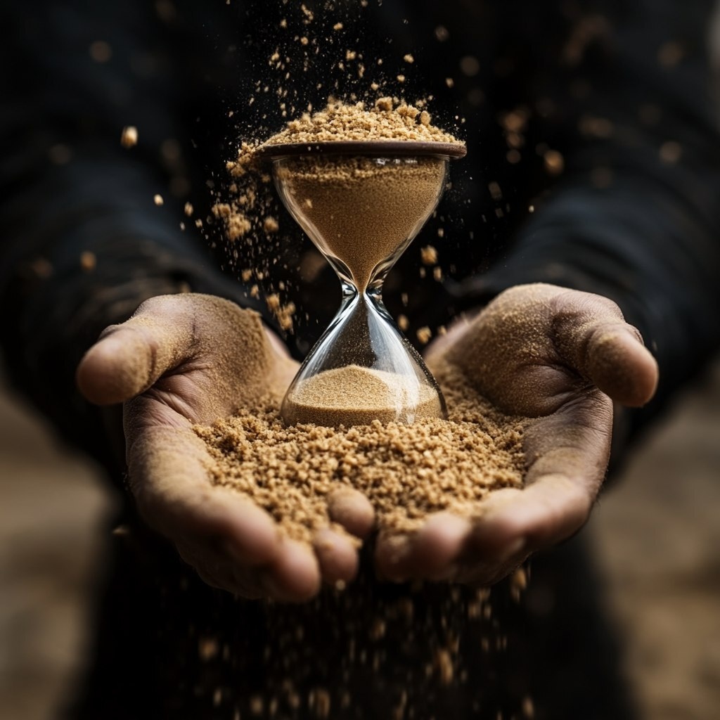 Создано на основе запроса: Pair of hands cupped, with a mound of sand on the hands, coming from the top half of a broken hourglass that is