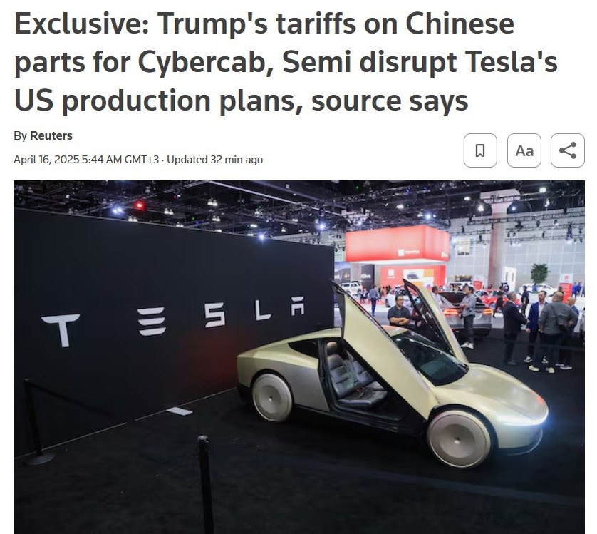 Планы Tesla начать в октябре производство роботакси Cybercab и грузового электромобиля Semi под угрозой из-за пошлин США. Об этом пишет Reuters со ссылкой на источники. Американская компания не может закупать в Китае комплектующие для этих моделей. После ввода тарифов в размере 34% Tesla ещё была готова взять на себя дополнительные расходы, но пошлины выросли до 145%, отмечают в статье. Тем временем Трамп заявил в Truth Social, что США получают «рекордные» суммы, а стоимость почти всех товаров и инфляция в стране снижаются. 🟩 Подписаться | Прислать новость | Читать аналитику