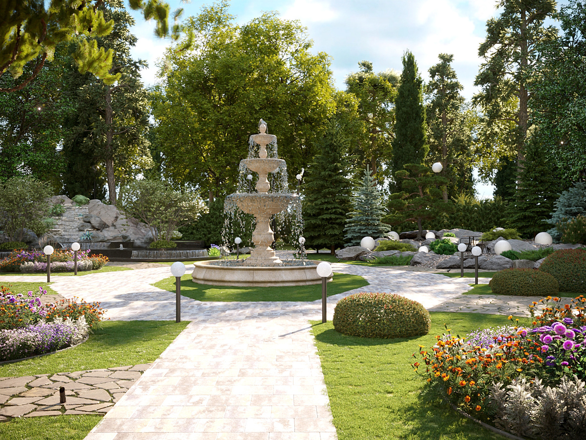 Мне предложили поработать с общественным пространством: клумбой в парке. Когда-то тут был розарий, росло несколько деревьев, и на фоне окружающего парка эта зона не была примечательна, хотя по задумке проектировщика комплекса эта зона должна быть акцентной и видовой. Возможно при Союзе так и было. В центральной части разместил высокий фонтан, в темное время подсветка должна выделить струи воды. Был еще один вариант фонтана в виде земного шара из нержавеющей стали, но классическое решение лучше вписалось в окружение, в сочетание с существующей архитектурой. Периметр территории окружен живой изгородью из купрессоципариса Лейланда (Cupressocyparis leylandii) 2,5 метра высотой. Получается, что с окружающих дорожек внутренняя панорама зоны открывается небольшими фрагментами с неизменным фонтаном, вызывая любопытство и заставляет зайти внутрь. Вокруг фонтана располагаются четыре зоны. Для каждой было придумано назначение, олицетворяющее стихию - воды, земли, огня, воздуха. В зоне воды
