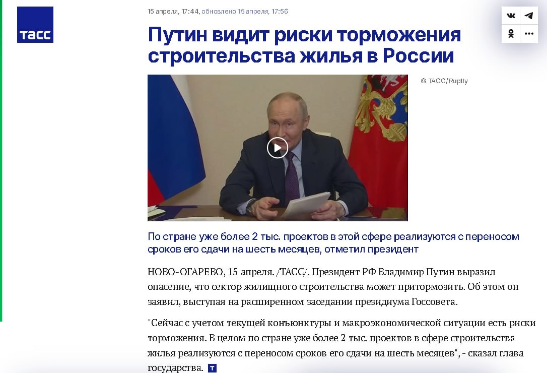 Во. уже пошли первые цифры с начавшегося заседания Госсовета, есть с чем работать. Ловлю на лету. Путин: "Сейчас с учетом текущей конъюнктуры и макроэкономической ситуации есть риски торможения. В целом по стране уже более 2 тыс. проектов в сфере строительства жилья реализуются с переносом сроков его сдачи на шесть месяцев", - сказал глава государств Смотрим ЕИСЖС. На апрель возводится 11350 многоквартирных домов. 2 тыс. из них — это 17,62%. Это с переносом на 6 месяцев. А на 5 месяцев сколько? А на 4, а на 3, а на 2, а на 1, который потом плавно перетечёт в полгода. Я так полагаю, дофигища! 🚀 📱Витрина готовых справок по надёжности ЖК Зде info; здесь 📱Форум Ззз здесь.