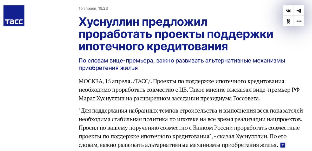 Всё! Можно больше не следить. Хуснуллин предложил проработать проекты поддержки ипотечного кредитования По словам вице-премьера, важно развивать альтернативные механизмы приобретения жилья Проекты по поддержке ипотечного кредитования необходимо проработать совместно с ЦБ. Такое мнение высказал вице-премьер РФ Марат Хуснуллин на расширенном заседании президиума Госсовета. "Для поддержания набранных темпов строительства и выполнения всех показателей необходима стабильная политика по ипотеке на все время реализации нацпроектов. Просил по вашему поручению совместно с Банком России проработать совместные проекты по поддержке ипотечного кредитования", - сказал Хуснулллин. Всё в сослагательном наклонении, в будущем времени. Никакой поддержки на этом заседании оказано не будет. Общий посыл. Работайте! Ну и нам пора отдыхать. Расходимся. Дальше не интересно! Дежурное мероприятие, без последствий. Застройщики, если вы на что-то надеялись? Ну что ж, сочувствую. Облом! 🤏 📱Витрина готовых спр