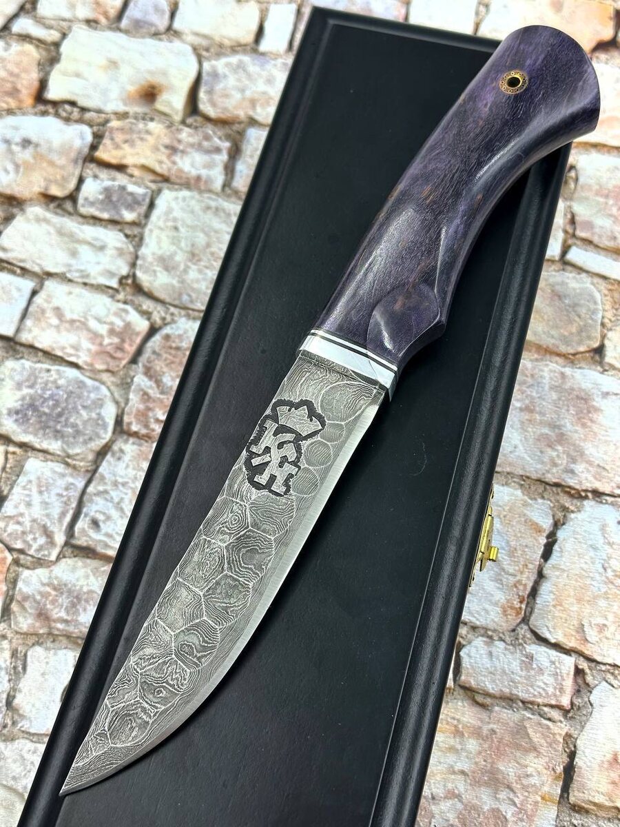 Нож Путник из дамасской стали с обработкой клинка под камень и ручной гравировкой логотипа Кузницы Назарова В.В. Дамаск 950 слоев, крученка, твёрдость 62 HRC, заточен до бритвенного состояния. Анатомическая рукоять из стабилизированной карельской берёзы фиолетовой. Цена ножа в комплекте с ножнами по акции по 30 апреля 12104 руб. Обычная цена 15130 руб. Можем изготовить формованные ножны из кожи растительного дубления (+ 8000 руб.) Для заказа писать на @Nazarklinokbot или по тел +79101343831, WhatsApp