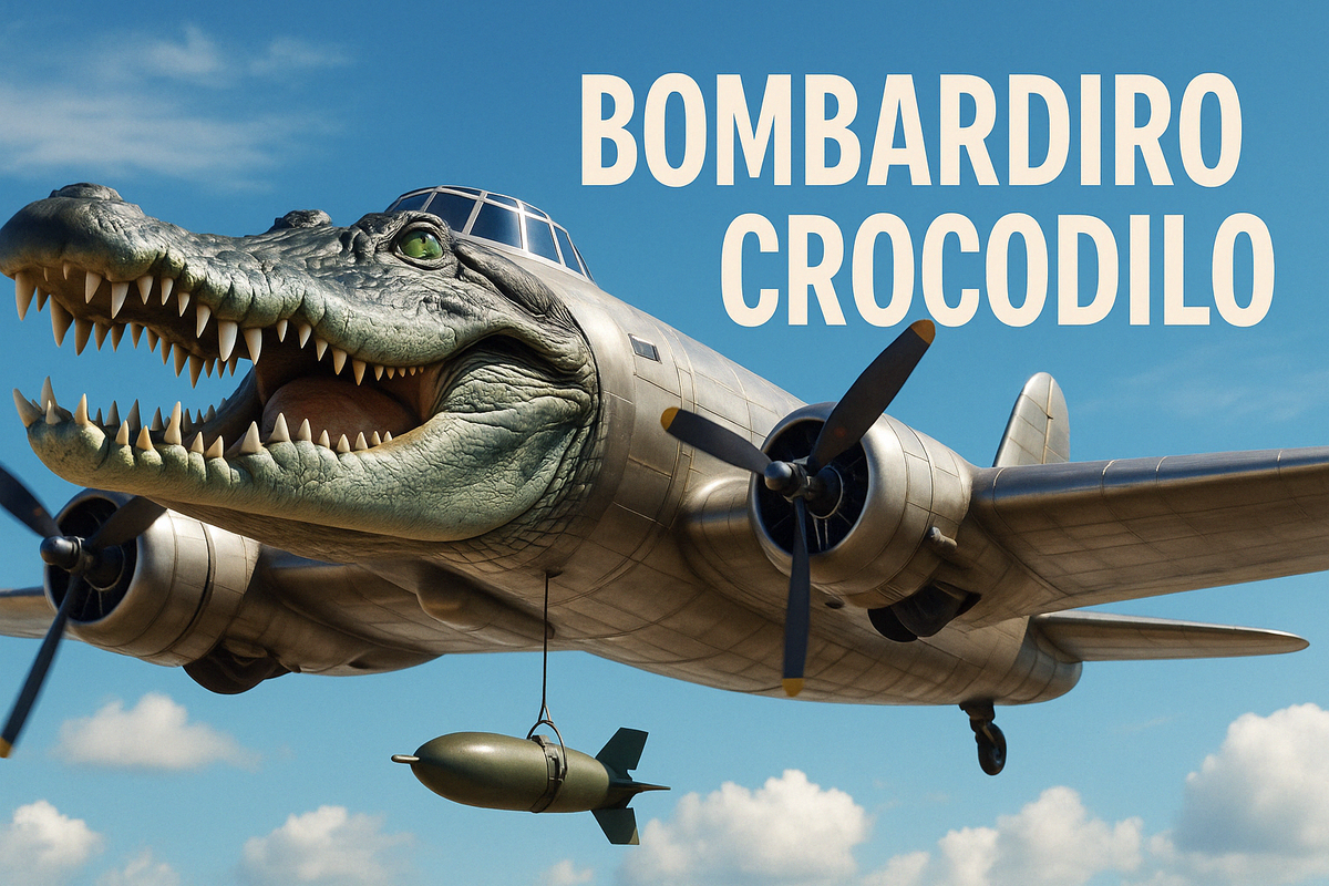Как крокодил стал самолётом и зачем он пролетает над нашими головами Никто точно не знает, откуда он появился. Некоторые предполагают — из глубин нейросетевого бреда, как побочный эффект усталого запросa вроде «reptile WWII aircraft with personality». Другие говорят — он был с нами всегда, просто раньше мы не умели его видеть. А теперь — умеем. Так или иначе, в один прекрасный день на экране появился Bombardiro Crocodilo. Серьёзный. Не моргает. С зубами. Сверху — массивная крокодилья голова с выражением «я знаю больше, чем ты думаешь», снизу — тело старого военного бомбардировщика, из которого торчат тяжёлые барабаны, явно предназначенные не для музыки, а для сброса смысла. Он не похож ни на кого. И в этом его сила. Bombardiro Crocodilo — не просто нейросетевой глюк. Это символ. Гибрид двух форм: животного инстинкта и машины действия. Он несёт в себе тревожную грацию доисторического зверя и методичную мощь механики прошлого века. Он знает, как выглядят города с высоты. Он чувствует зап