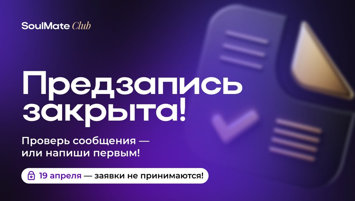 🆘❗️ Важное объявление для участников предзаписи в SoulMate Club! Друзья, мы вчера начали отправку персональных приглашений тем, кто оставлял заявку на участие в клубе. Но Telegram заблокировал нам массовую рассылку сообщений, и мы не смогли написать всем! 📊 Из 283 заявок — отправили только 159 сообщений ❗️ 124 человека до сих пор не получили приглашение! ⚠️ Если вы участвовали в предзаписи, но не получили от нас сообщение — свяжитесь с нами! 📩 Напишите прямо сейчас на один из официальных аккаунтов поддержки: @careservice_soulmate — Наталья @ambassador_soulmate — Альвина @SoulMateClub_support — Надежда @ambassador_soulmate1 — Анна @ambassador_soulmate11 — Александр Просто отправьте короткое сообщение: «Участвую в предзаписи» ✅ Мы проверим вас по списку и вышлем персональное приглашение с бонусами и доступом в SoulMate Club. 🎁 Напоминаем, что для всех участников предзаписи действуют два варианта: 🟣 Вариант 1. Вы сразу приобретаете подписку, получаете 20% скидку, +1 ме