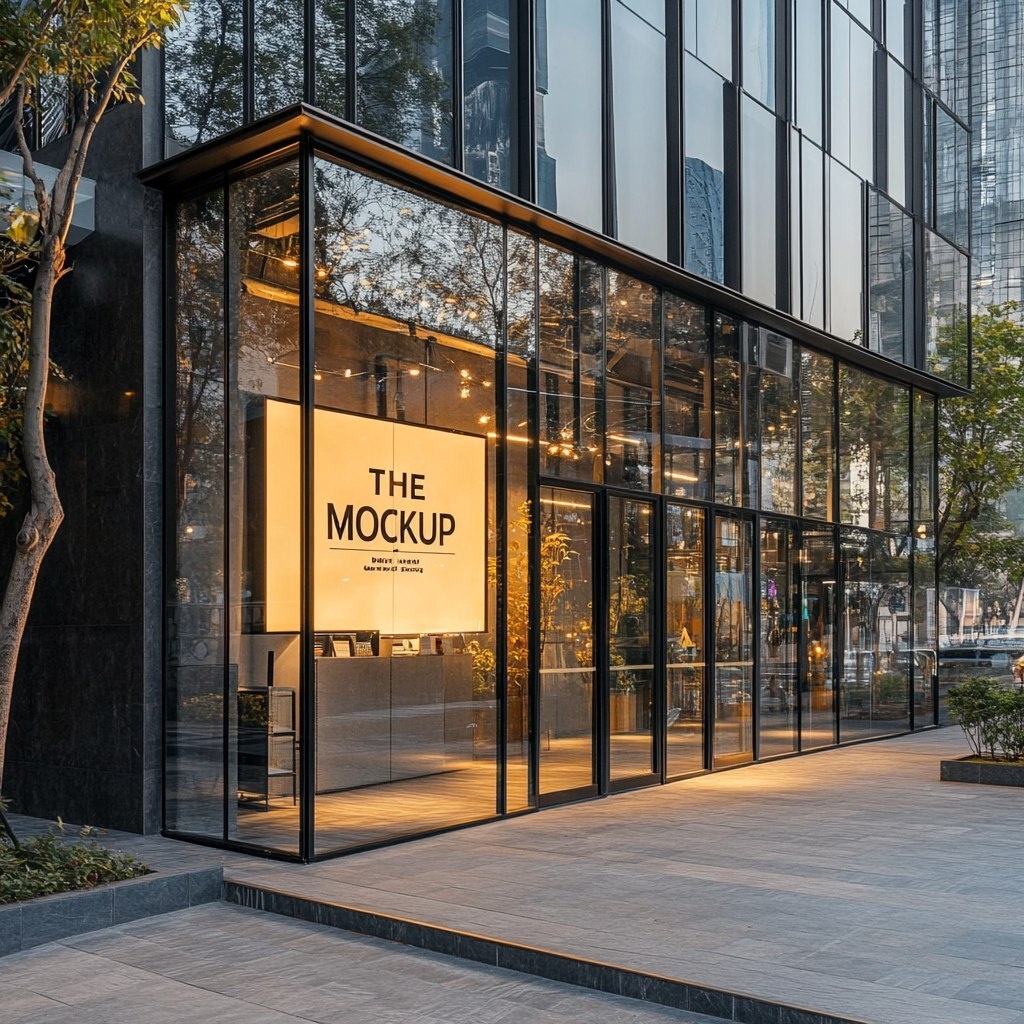 Создано на основе запроса: A modern storefront of a building with glass facades, housing a Branding Agency, with a logo sign The sign features an aesthetic mockup with large, elegant font "THE MOCKUP". The banner background is warm beige. The storefront is framed by dark metal frames, with trees, light, and reflections of the environment visible through the glass, creating an urban, stylish, minimalist mood. --- Автоперевод: Современный магазин здания со стеклянными фасадами, в котором размещается брендинговое агентство, со знаком логотипа. Знак оснащен эстетическим макетом с большим элегантным шрифтом «Макет». Как тебе этот вариант? 🤔 https://dzen.ru/id/65c0c65c86e4f837c27b24d7 #ИИ #AI #нейросеть #midjourney #art