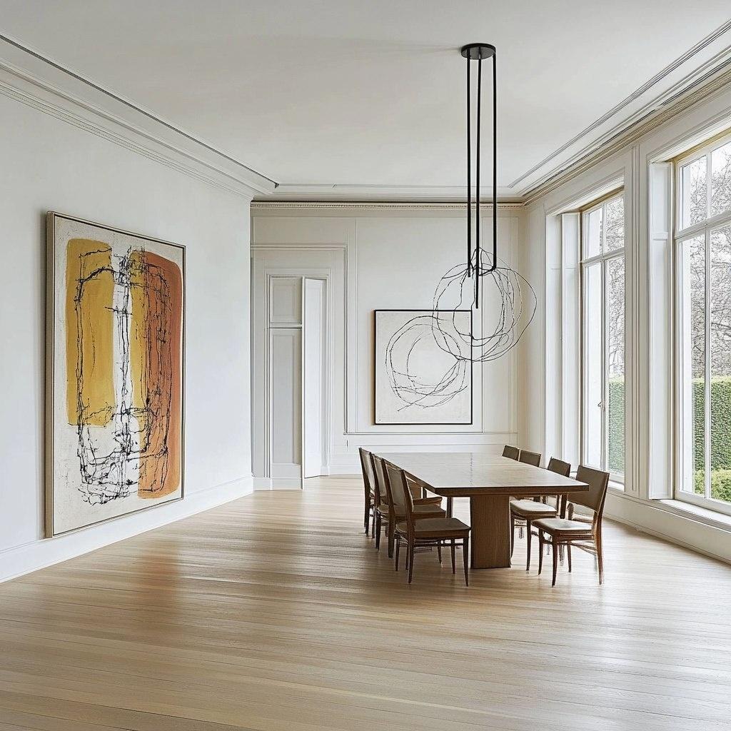 Создано на основе запроса: white room with mahigany wooden flooring, empty room, artwork on wall, empty