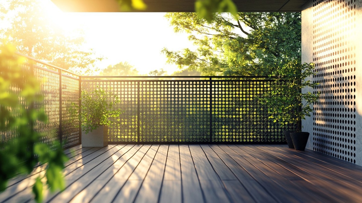 Создано на основе запроса: Create an outside view of a modern balcony in Germany surrounded by a railing of perforated sheet plate. The perforation is the hero of the image, don’t make the holes too small for less imageerrors. Singe family home. ultrarealistic, editorial style, natural lighting. Organic feel with plants. cosy feel with the sun shining through the metal sheets. wooden balcony floor --- Автоперевод: Создайте внешний вид современного балкона в Германии, окруженном перилами перфорированной листовой пластины. Что скажешь? 🤔 https://dzen.ru/id/65c0c65c86e4f837c27b24d7 #ИИ #AI #нейросеть #midjourney #art
