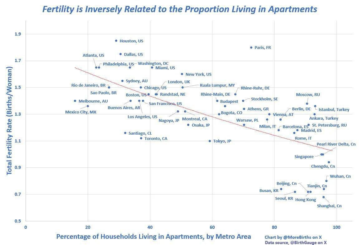 Исследования показывают интересную корреляцию: в крупных агломерациях мира рождаемость связана с типом жилья. Чем выше доля семей, проживающих в отдельных домах (в противовес квартирам), тем выше, как правило, показатель рождаемости. Этот феномен можно объяснить несколькими факторами: ⦁ Простор и комфорт: Отдельные дома обычно предлагают больше жилого пространства, чем квартиры. Это особенно актуально для семей с детьми, которым нужны отдельные комнаты, игровая зона и задний двор. Больший комфорт проживания может стимулировать решение завести больше детей.