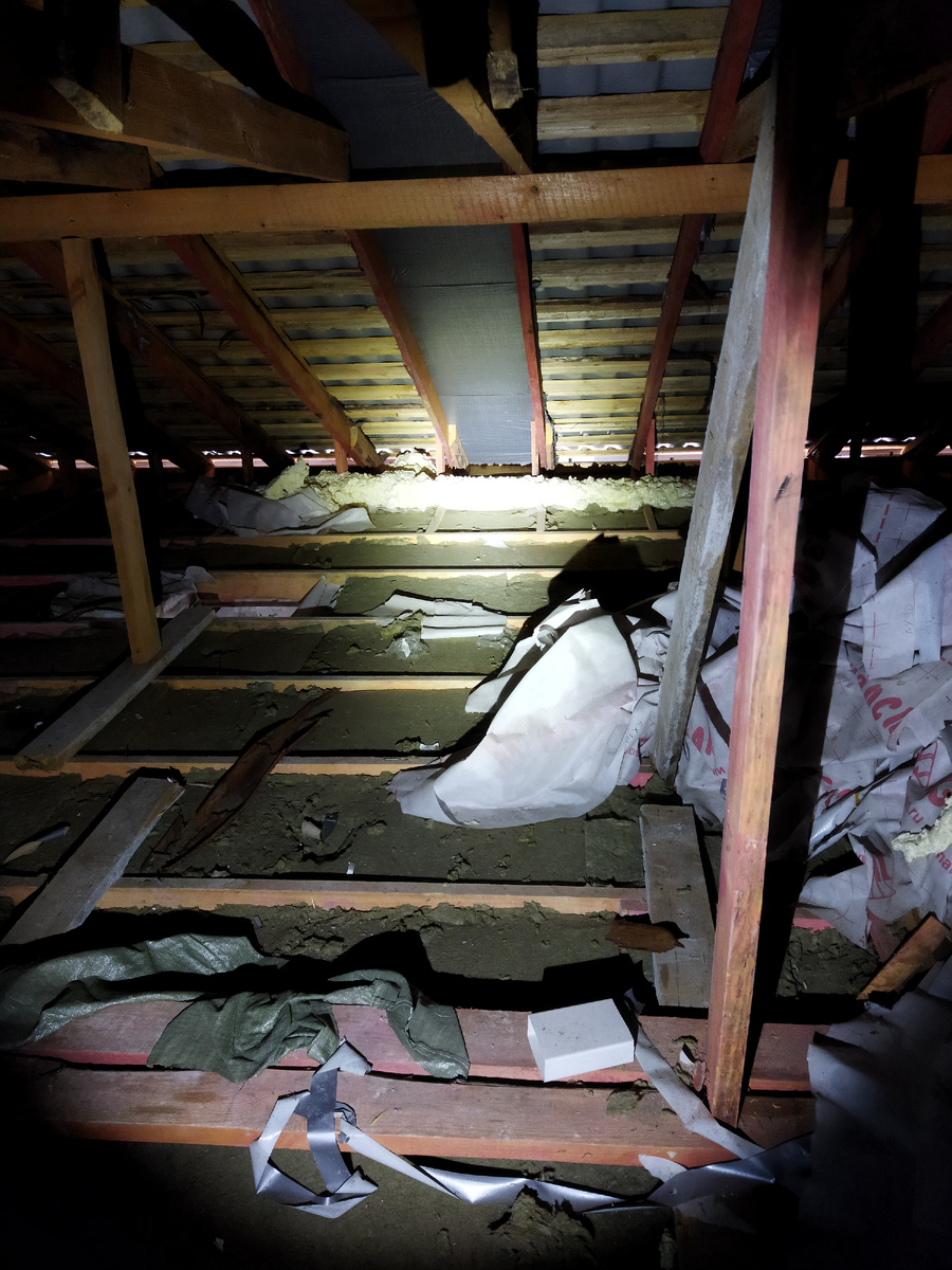 Уже более 300 объектов я обследовал и привык ко многим замечаниям. Но на прошлой неделе мне попался объект, который меня удивил! Снаружи - шикарный коттедж, облицовка фасада, аккуратно выполненная работа по кровле, снегозадержатели и др. А внутри... Меня ждал сюрприз! И не один... Видимо собственник этого дома поссорился со своей бригадой и они... - заморозили ему дом с полностью выполненной отделкой: радиаторы повзрывались из-за замерзания теплоносителя в системе, которым служила обычная вода... Далее - произошел потоп со всеми вытекающими, в прямом смысле, последствиями. - и самое жесткое наказание от строителей: они срезали ему гидро-ветрозащитную мембрану на холодном чердаке! См. фото ниже. Т.к. кровля из металлочерепицы подвержена активному образованию конденсата с внутренней поверхности листов, то гидроветрозащитная мембрана - это просто необходимость, без которой правильная эксплуатация без последствий не возможна. Поэтому с виду красивая кровля оказалась полностью - под