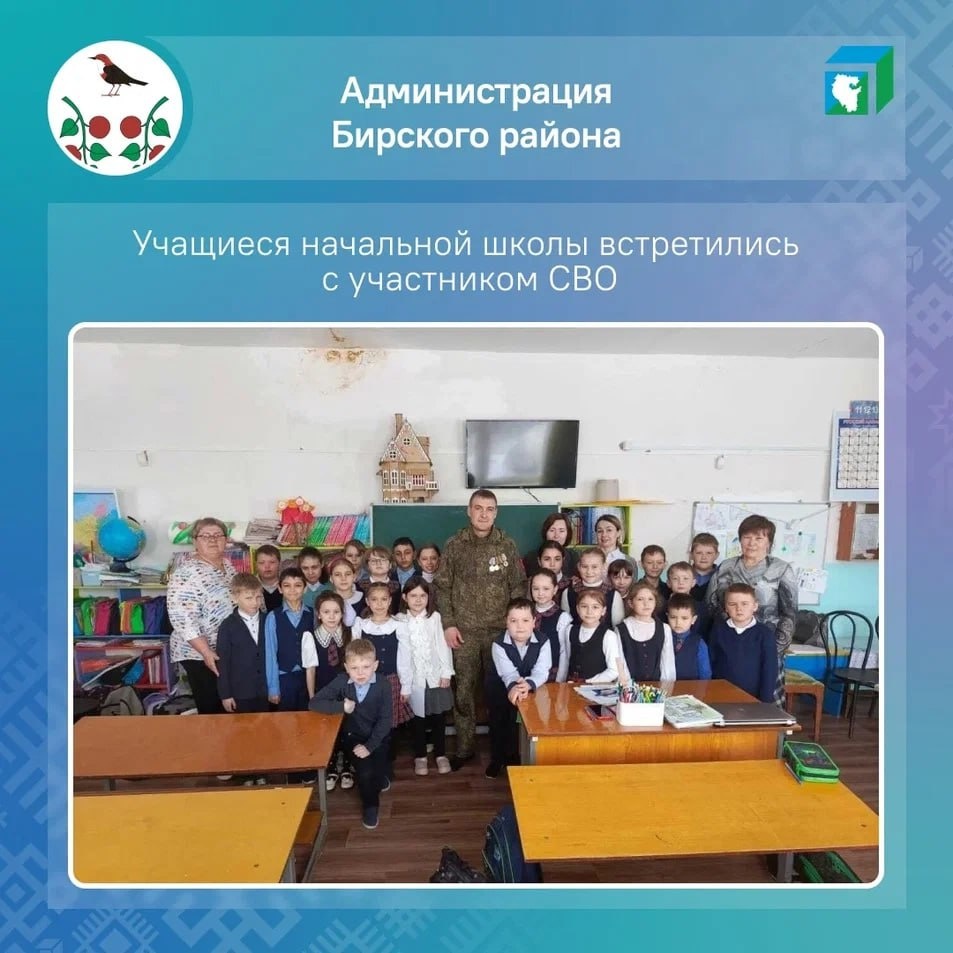 Участники специальной военной операции из Башкортостана, которые приезжают в отпуск, часто становятся почетными гостями в школах, волонтерских объединениях и администрациях муниципалитетов. Ученики начальной школы Бирского района встретились со своим земляком – участником СВО. Военнослужащий рассказал ребятам о службе, о том, как проходит операция, какие задачи выполняют солдаты, а также о том, как спасал своих товарищей и за что получил свои награды. Жители села Исанбаево Янаульского района пообщались с земляком - участником специальной военной операции с позывным «Татарин». За год в зоне СВО боец прошел через множество испытаний, а сегодня находится в отпуске по ранению и проходит реабилитацию. Но не остается в стороне от важных задач в тылу – он вступил в местное отделение движения «Боевое братство» и активно участвует в патриотических мероприятиях. Урок мужества «Герой нашего времени» прошел в школе деревни Новые Казанчи Аскинского района. Ученики встретились с участниками СВО,