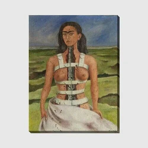 Она стоит перед нами — хрупкая, израненная, почти разваливающаяся на части, но в её глазах нет покорности. Фрида Кало пишет себя не просто больной, а расколотой, как земля после землетрясения. Её тело — это поле битвы, где каждый день — сражение с болью, каждый вдох — напоминание о том, что жизнь не пощадила её. Там, где должен быть позвоночник, — античная колонна, треснувшая до самого основания. Она ещё держится, но сколько выдержит? Каждый изгиб, каждый надлом — словно эхо того рокового дня, когда автобус переломил её юность. Тело стало клеткой, а боль — вечным спутником. Грудь и живот разорваны, будто кто-то провёл ножом по холсту её плоти. Сквозь зияющие раны видна колонна-позвоночник, едва сдерживающая её от окончательного падения. И гвозди — десятки острых гвоздей, впившихся в кожу. Они не убивают, но каждый шаг, каждое движение — это удар, это жгучее напоминание: ты сломана. Её лицо — маска страдания, но не слабости. По щекам струятся слёзы, но взгляд не молит о пощаде, а бросае