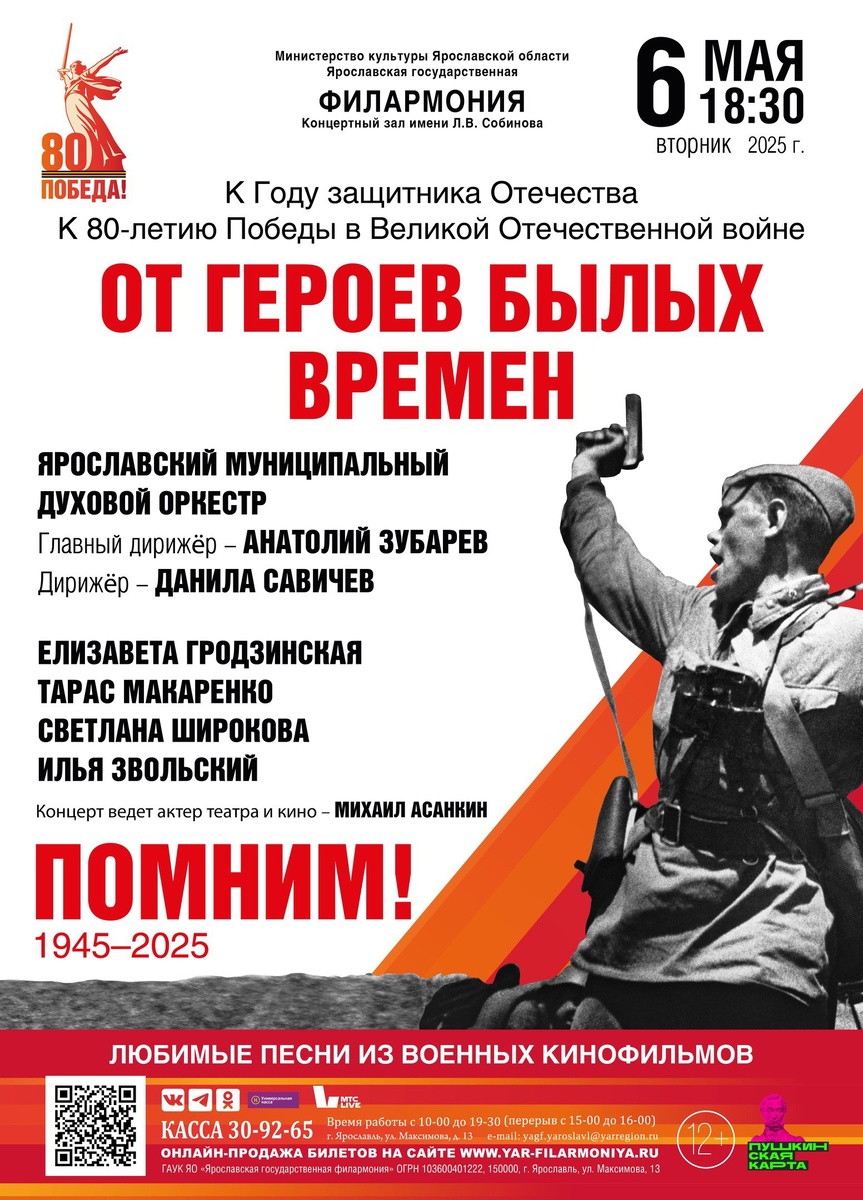 6 мая 2025 г. в 18:30 в Ярославской филармонии состоится концерт «От героев былых времен», посвященный Году защитника Отечества и 80-летию Победы в Великой Отечественной войне. https://clck.ru/3Kfngk Великая Отечественная война оставила неизгладимый след в истории и судьбе каждой семьи, а песни, посвященные военным годам, бережно хранят память о тех, кто сражался за Родину. 🎶 В программе вечера прозвучат проникновенные композиции, знакомые каждому: «От героев былых времен» из кинофильма «Офицеры», «За того парня», «В лесу прифронтовом», «Севастопольский вальс», «На безымянной высоте» и многие другие. Завершит концерт песня «День Победы», которая стала неизменным атрибутом торжеств, посвящённых победе в Великой Отечественной войне. 👏👏👏 Программу исполнит Ярославский муниципальный духовой оркестр под управлением главного дирижёра Анатолия Зубарева и дирижёра Данилы Савичева. Солисты – Елизавета Гродзинская, Тарас Макаренко, Светлана Ши Показать полностью... https://yar-filarmoniya.r